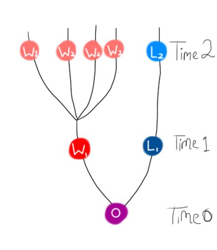 We can set aside the bit about merging brains together for now; that isn’t causing our problem. Consider a simpler and smaller (for the sake of easy diagramming) lottery setup where after you win or lose you are woken for ten seconds as a single person, then put back to sleep and woken as four copies in the winning branch or one in the losing branch. See the diagram below. You are at Time 0 (T0). Before Time 1 (T1) the lottery is run, so at T1 the winner is W1 and the loser is L1. W1 is then copied to give the multitude of winning experiences at T2, while L2 remains single.